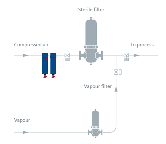 In some cases it makes sense to use counterflow sterilisation.  In this case, the steam flows from the clean side of the sterile filter through the filter housing. For example, if not only the sterile filter but also the vessel behind it is to be sterilised.