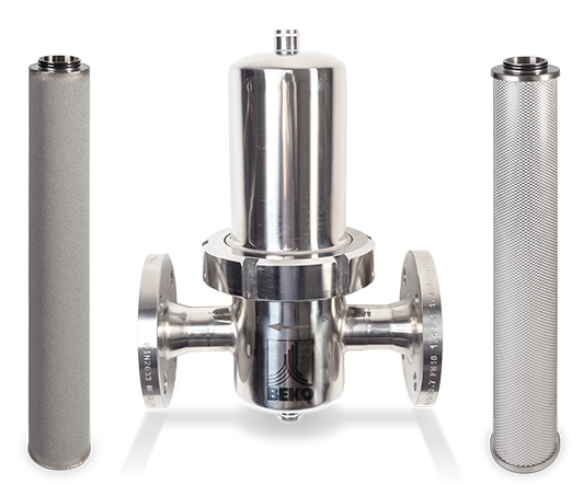 Many industrial applications require sterile compressed air and high flow rates at low differential pressures. CLEARPOINT® sterile filters offer efficient bacteria and virus removal as well as a high flow rate, even at low utilisation. They are ideal for sensitive areas such as the food, chemical and pharmaceutical industries. The sterile filters are approved for indirect food contact, heat-resistant up to 180 °C and particularly durable. They are supplied in high-quality stainless steel housings. To maintain sterility, the sterile filters are regularly sterilised with saturated steam. For this purpose, BEKO TECHNOLOGIES offers the CLEARPOINT® steam filters, which use the same housing as the sterile filters.