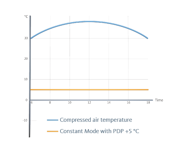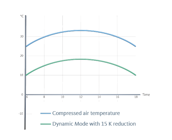 The pressure dew point will be reduced relative to the compressed air temperature by a specified difference between 10 and 55 Kelvin in “Dynamic Mode”. If the inlet temperature changes, the pressure dew point will automatically follow suit. This provides complete safety to ensure that the correct degree of drying is always retained even with changing compressed air temperatures.