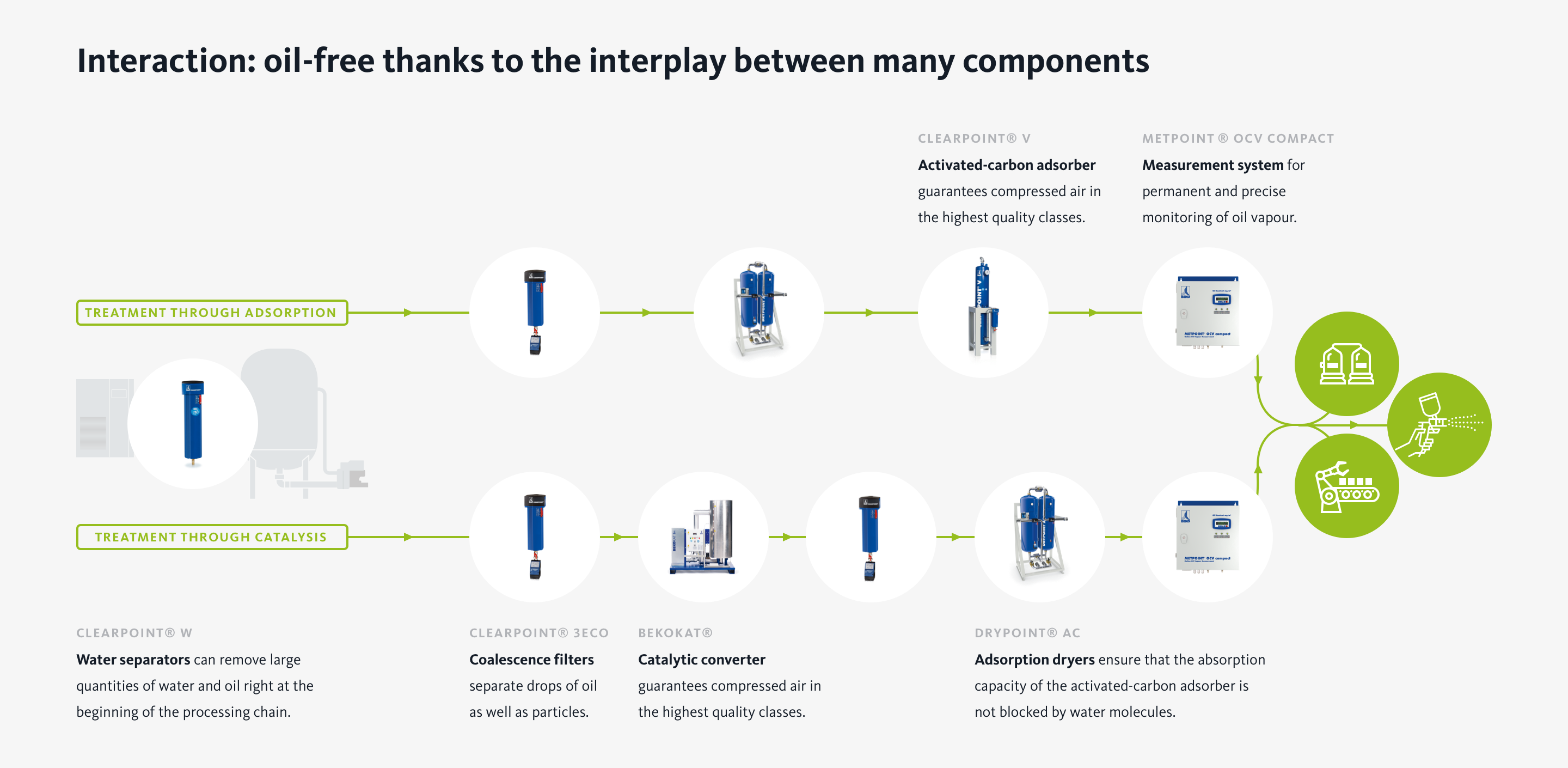Generally speaking, there are several ways of producing oil-free compressed air. The special requirements must be given careful consideration during planning. This starts with the question of whether oil-free compressed air has to be available centrally or whether treatment can be decentral, since only part of the flow is subject to particularly high requirements.
